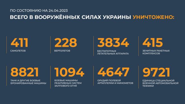 Всего с начала проведения специальной военной операции уничтожены: 411 самолетов, 228 вертолетов, 3834 беспилотных летательных аппарата, 415 зенитных ракетных комплексов, 8821 танк и других боевых бронированных машин, 1094 боевые машины реактивных систем залпового огня, 4647 орудий полевой артиллерии и минометов, а также 9721 единица специальной военной автомобильной техники.
