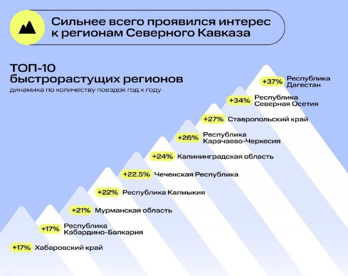 Дагестан продемонстрировал наибольший рост турпотока. Туда россияне поехали на 37 процентов больше раз, чем в 2022 году. На втором месте по приросту турпотока оказалась Северная Осетия. В ТОП-3 вошел еще Ставропольский край – динамика составила 27 процентов.