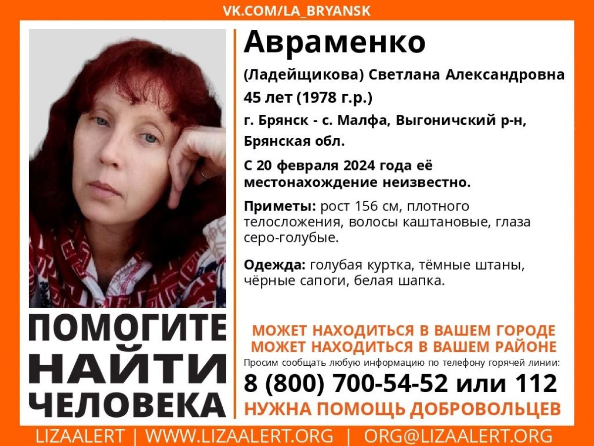 20 февраля пропала жительница села Малфа Выгоничского района Брянской области 45-летняя Светлана Александровна Авраменко (Ладейщикова). Об этом сообщили волонтеры поисково-спасательного отряда «ЛизаАлерт».