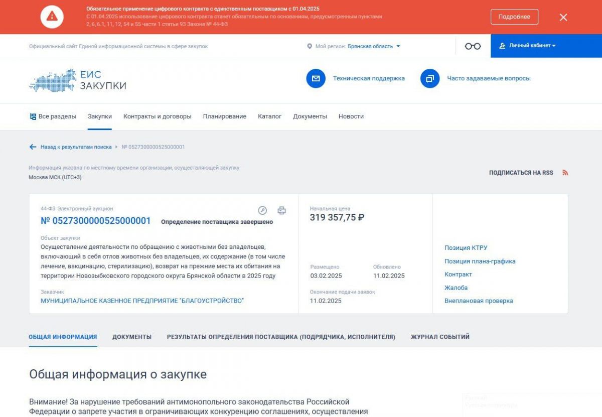 В сентябре администрация Новозыбкова провела торги на сумму 127 тысяч рублей — контракт заключён на «оказание услуг по обращению с безнадзорными животными» в Комаричах. Однако в документах также указано, что место оказания услуг — территория Новозыбковского округа. И даже с такими несостыковками закупка прошла.