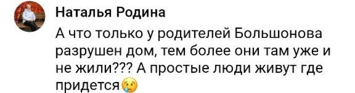 Жители Подывотья, которое не раз становилось мишенью украинских террористов, возмутились вопросу отца чемпиона Большунова про разрушенный дом, который не является для семьи единственным жильем. В комментариях брянцы подчеркнули, что в населенном пункте многие потеряли крышу над головой и сейчас вынуждены «жить где придется».