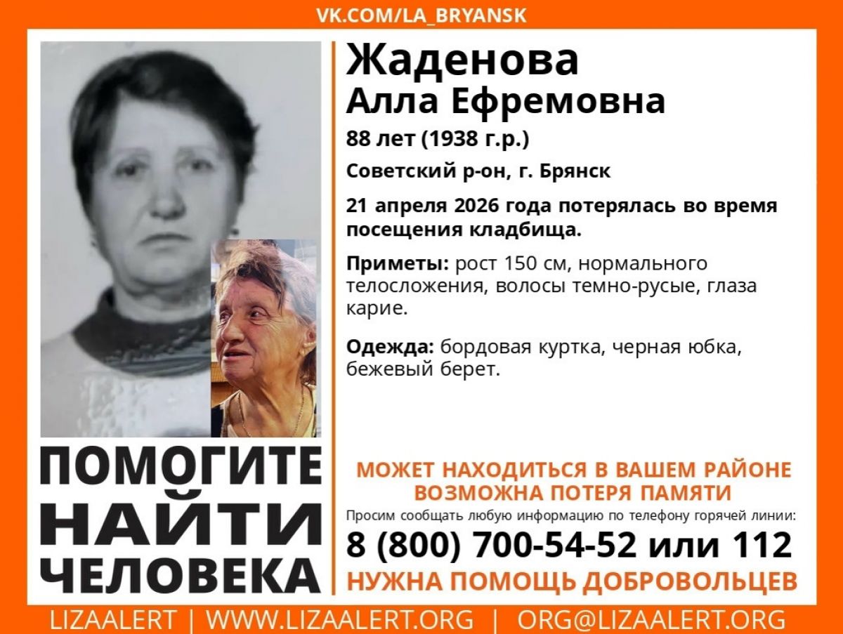 В Советском районе Брянска потерялась 88-летняя Алла Жаденова. По информации поискового отряда «ЛизаАлерт», 21 апреля она потерялась во время посещения кладбища.
