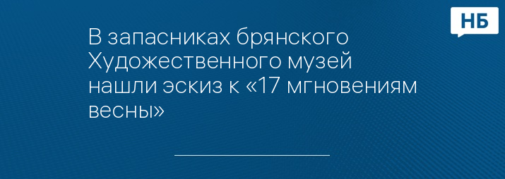 Оригинальный эскиз к фильму Татьяны Лиозновой «17 мгновений весны» нашелся в запасниках брянского Художественного музея. Об этом «Новостям Брянска» рассказал представитель правительства региона. Как оказалось, в запасниках музей храниться еще более 400 работ к советским кинопроизведениям, таким как мультфильм «Дядя Степа» (1939 год), фильму «Андрей Рублев» Андрея Тарковского и даже к «12 стульям» в постановке Леонида Гайдая.