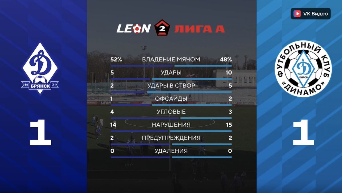 Брянское «Динамо» уступает кировскому 0:1 после первого тайма